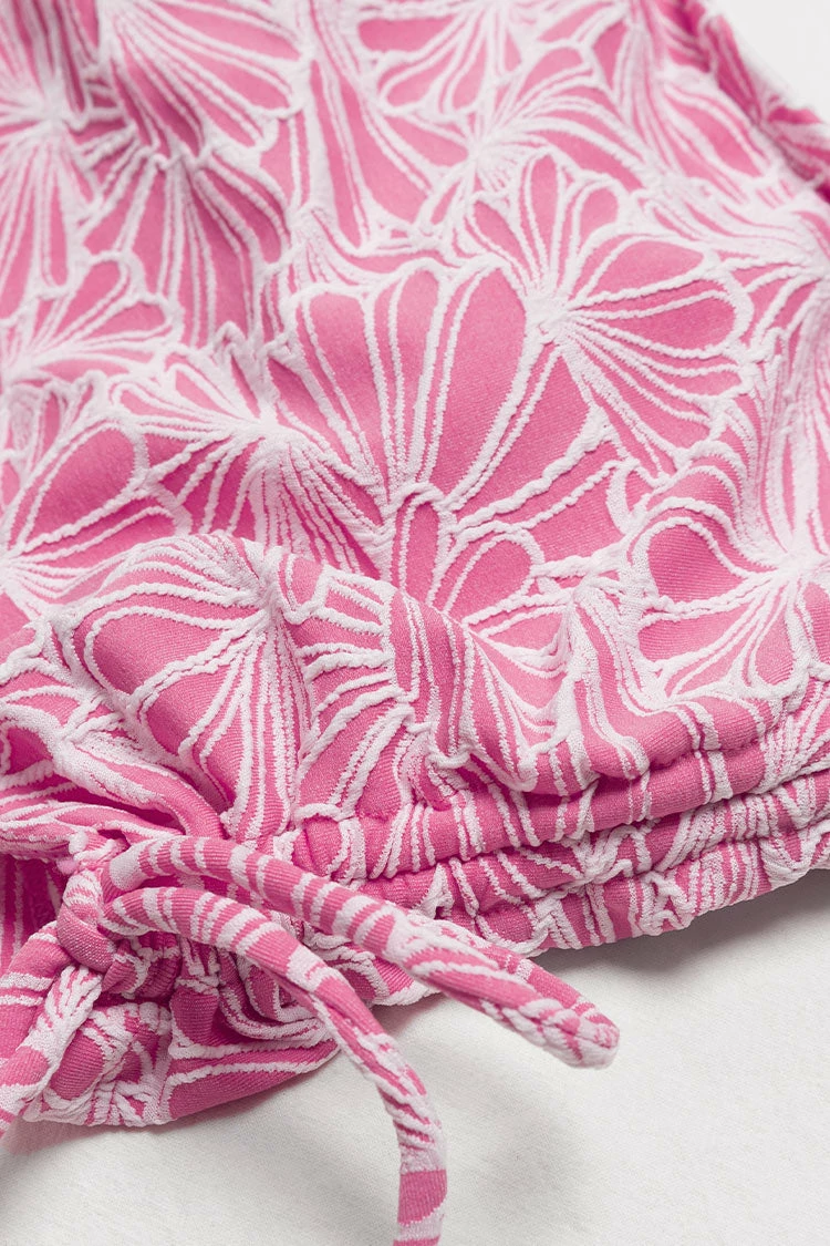 Get ready to slay in the sun with our Abigayle Jacquard Drawstring Side Halter Tankini. Bikini top features halter neck with drawstring sides for the perfect fit. Matching bottom has mid-waisted for flattering tummy coverage.