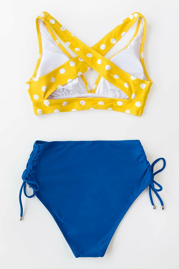 Our Blue Side Ruched High-Waisted Bikini Bottom brings a touch of fun. Features ruched sides with an adjustable ties. Mix and match with our Yellow Polka Dot Bikini Top for a perfect bikini set for the beach.