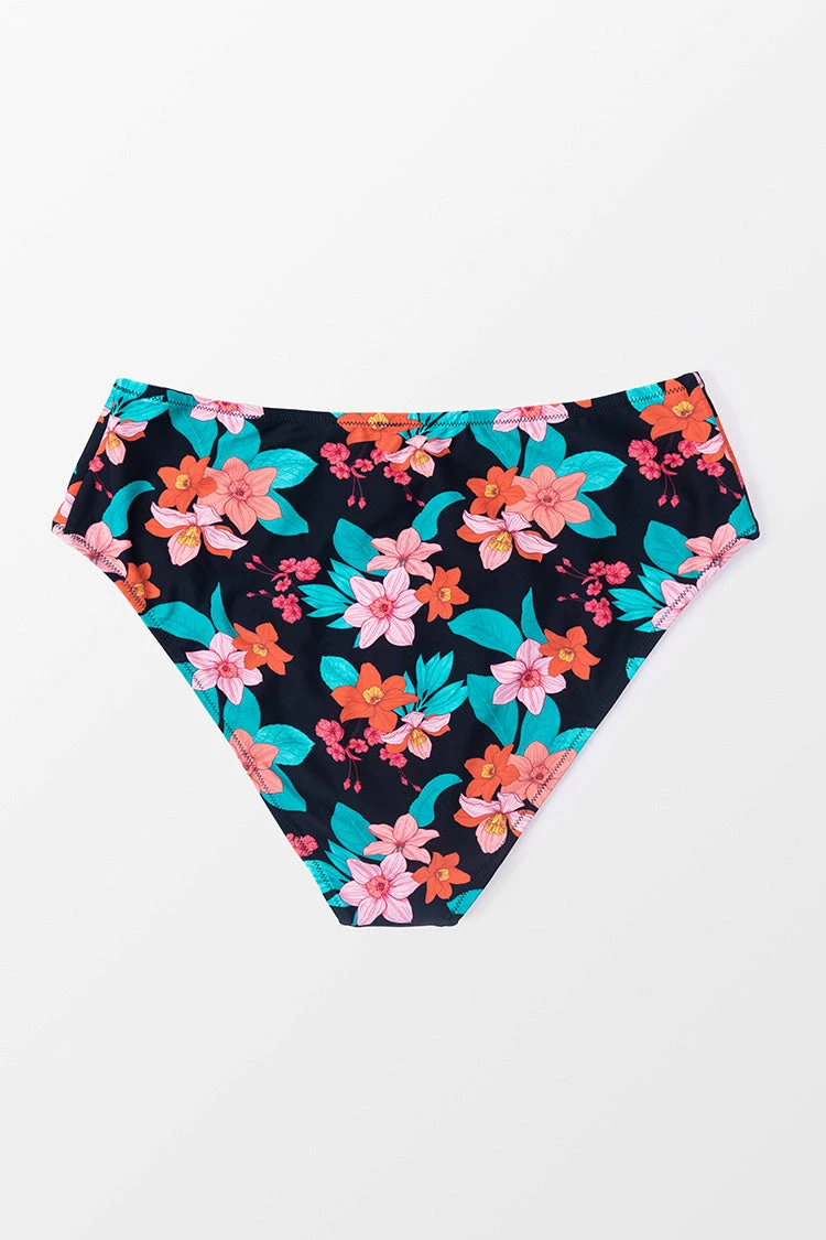 Grab eyes anywhere and anytime in Cynthia Floral High Waisted Plus Size Bikini Bottom. Black background and flower print are very eye-catching. Pair it with our Cynthia Plunge Back Tie Plus Size Bikini Top.
