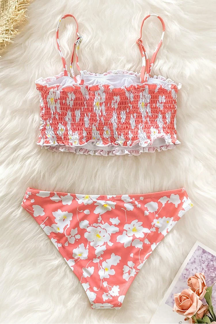 Feel cute and confident in the Floral Smocked Bandeau Bikini. This stretchy top gives you minimal tan lines and the shoulder straps can be dressed up crisscross at the back. The low-rise bottom shows off your curves.