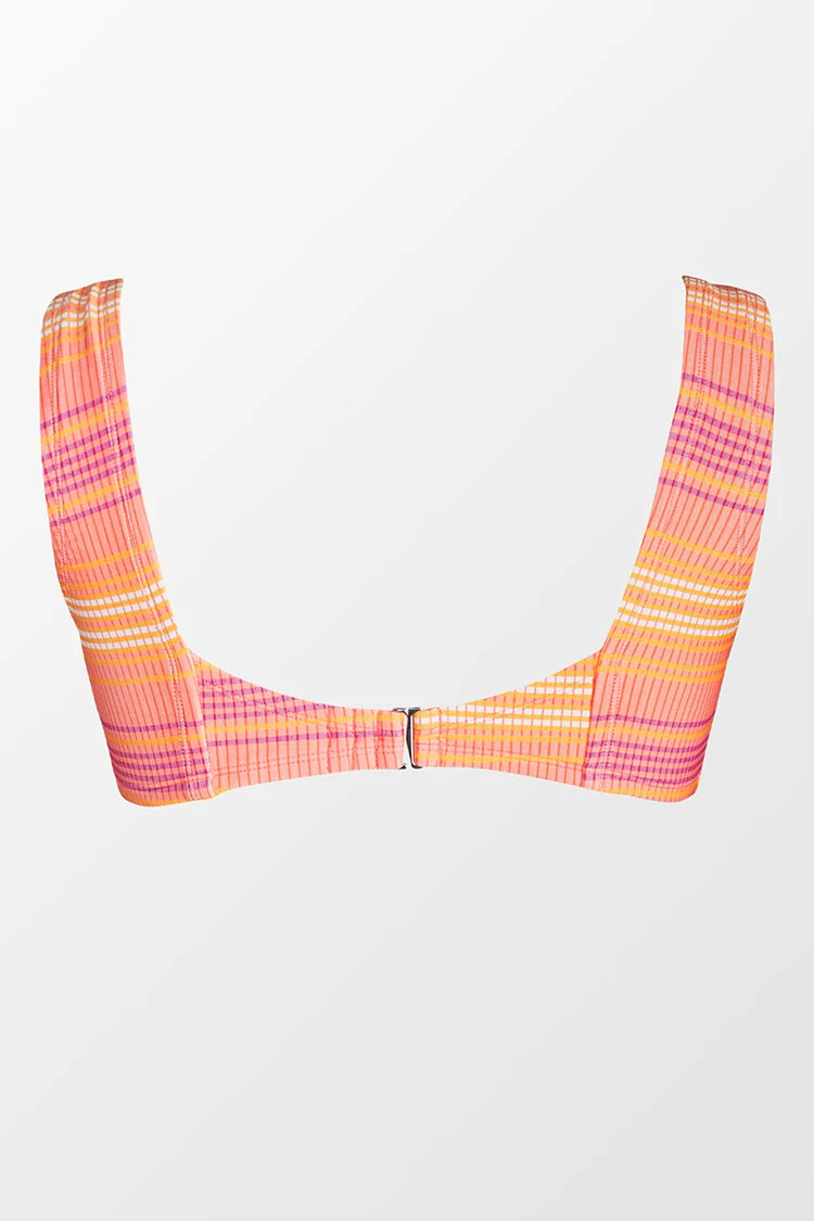 A colorful striped pattern meets strappy details for a bikini top that youβll want to wear again and again. The back hook closure provides a secure fit.