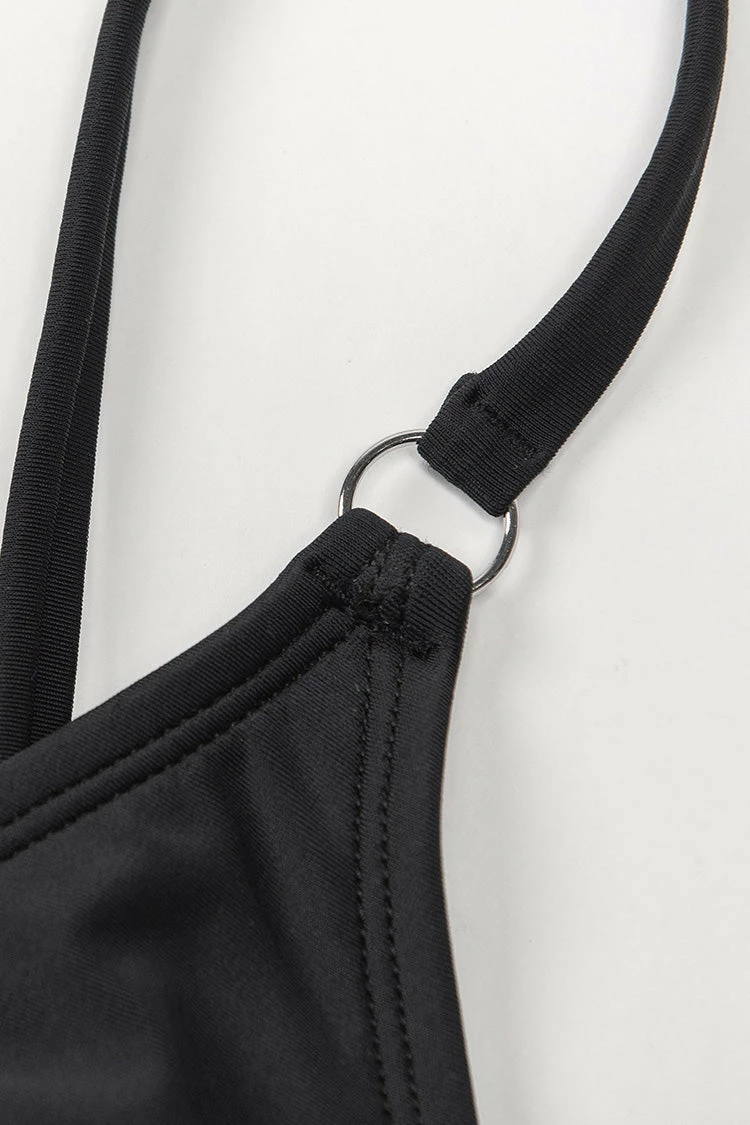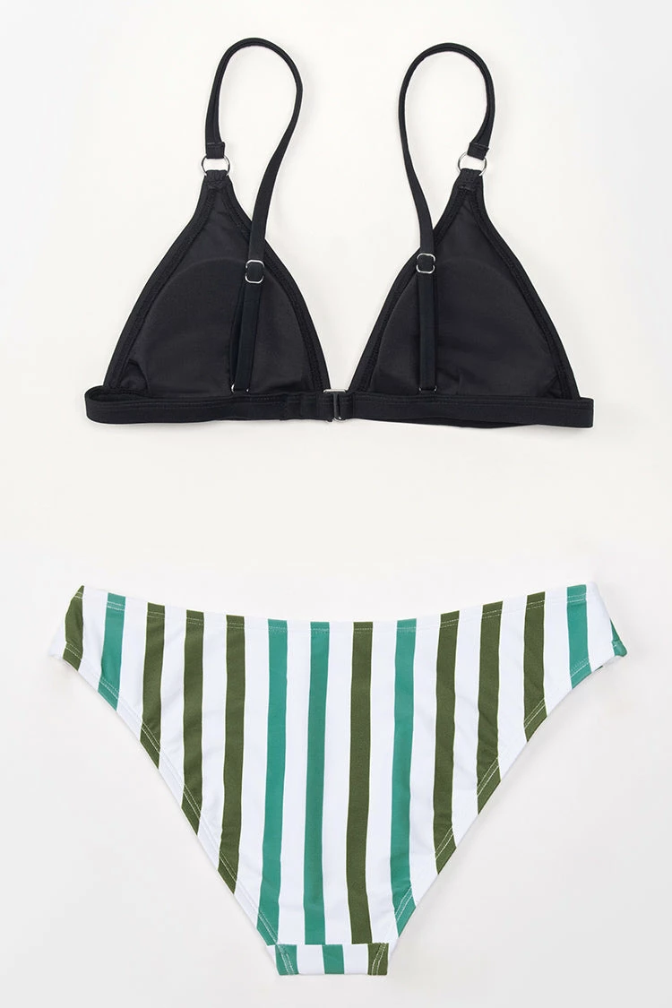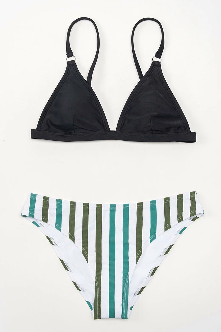 Chase the sun in our Alicia Striped Triangle Bikini. Triangle top features adjustable shoulder straps and o-ring detailing. The matching stripe bottoms have a cheeky coverage to show off your curves.
