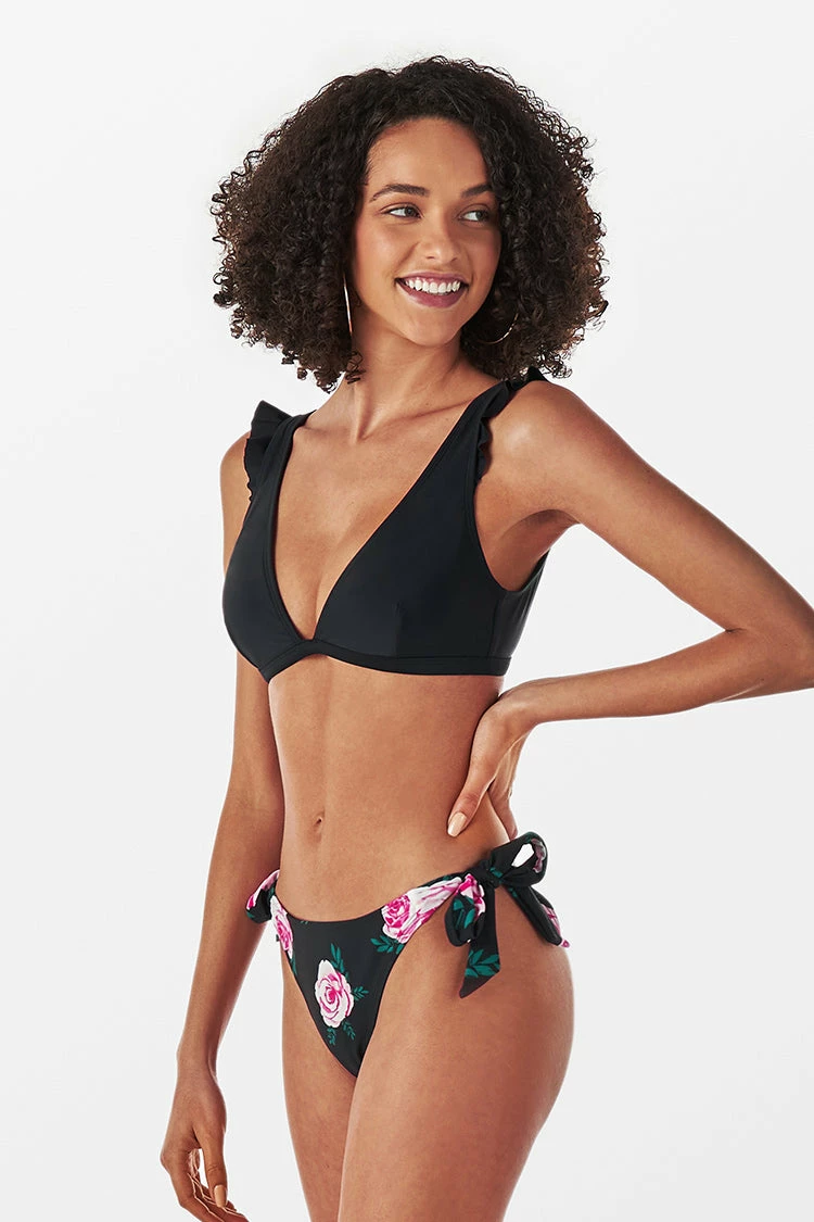 Our Melody Floral Side Ties Ruffle Bikini set will add to your cool girl vibes. The bikini top has a v-neckline with ruffle trim. The matching bikini bottom has a pretty floral print with side ties. The perfect low waisted fit to show off your curves.