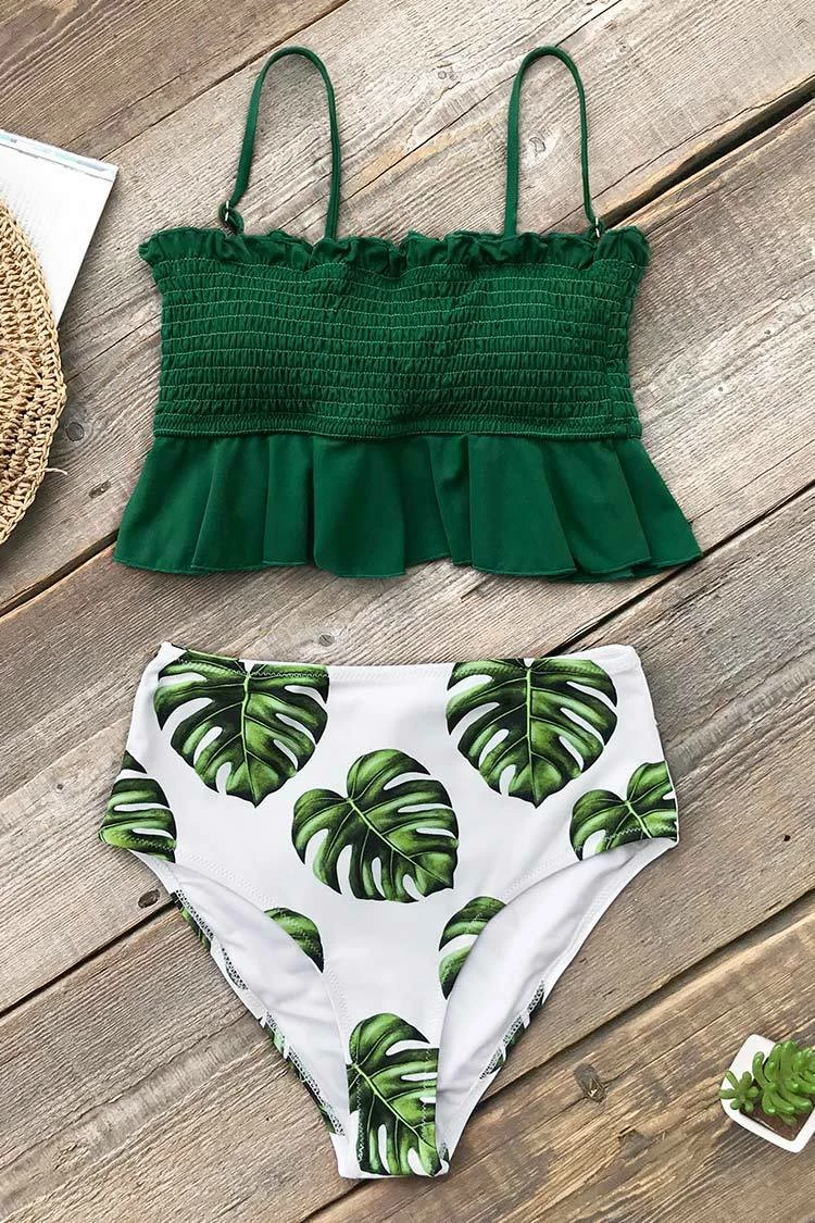 Hit the beach in our Green and Monstera High-Waisted Bikini! This bikini set features a smocked bikini top with ruffle trim in a pretty emerald green. The matching high-waisted bikini bottom features a monstera leaf print for a tropical trendy look.