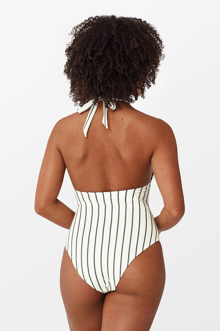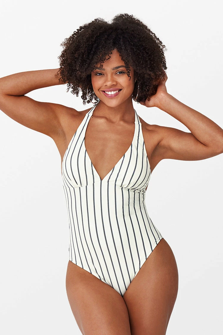 Perfect for a fun day under the sun. Our Alice Stripe Halter One piece Swimsuit is simply made for life’s simple pleasures. Features deep v-neck, backless and removable padded cups for light support.