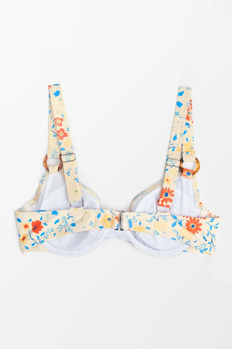Our Hayden Floral Underwire O-ring Bikini Top will be your favorite top for the summer. Features underwire soft cups with o-ring detailing. Complete the look with our Hayden Floral High Cut Bikini Bottom.