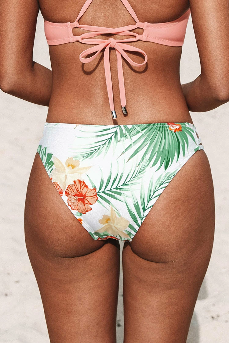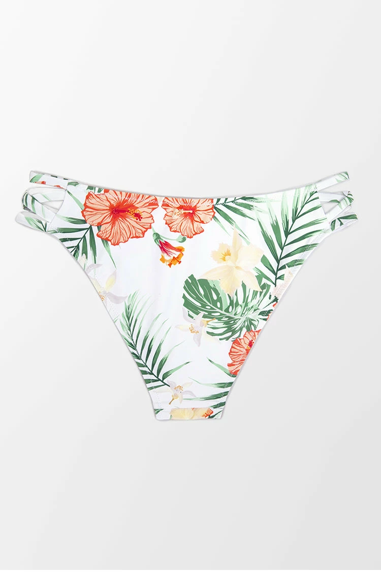 Get your sun-kiss glow in our Paola Tropical And Floral Bikini Bottom, featuring strappy cut-out details on the sides. Match with our Paola Ruched Front Crisscross Bikini Top.