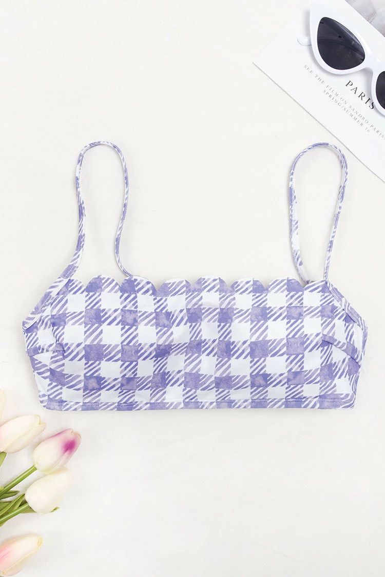 The summer picnic-inspired bikini top will get heads turning this holiday season. The cute bikini top is crafted with a square neck, a scalloped detail at the bust, and adjustable straps.