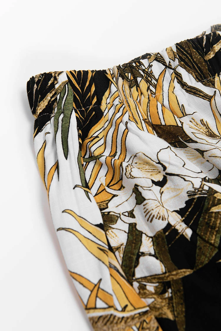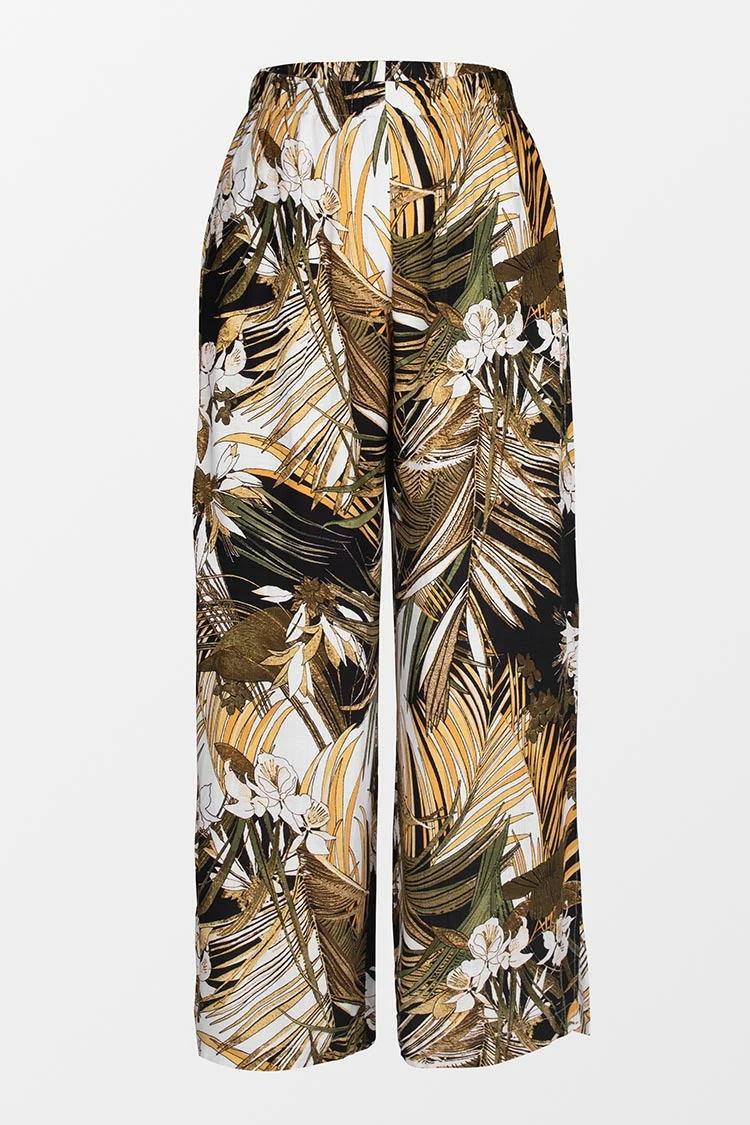 Take it easy in the Alexandria Tropical Plants Elastic Waist Pants. Passionate tropical print pattern, shapes these pants that have a high, elasticized waist and a flowy silhouette with side slits at the legs.