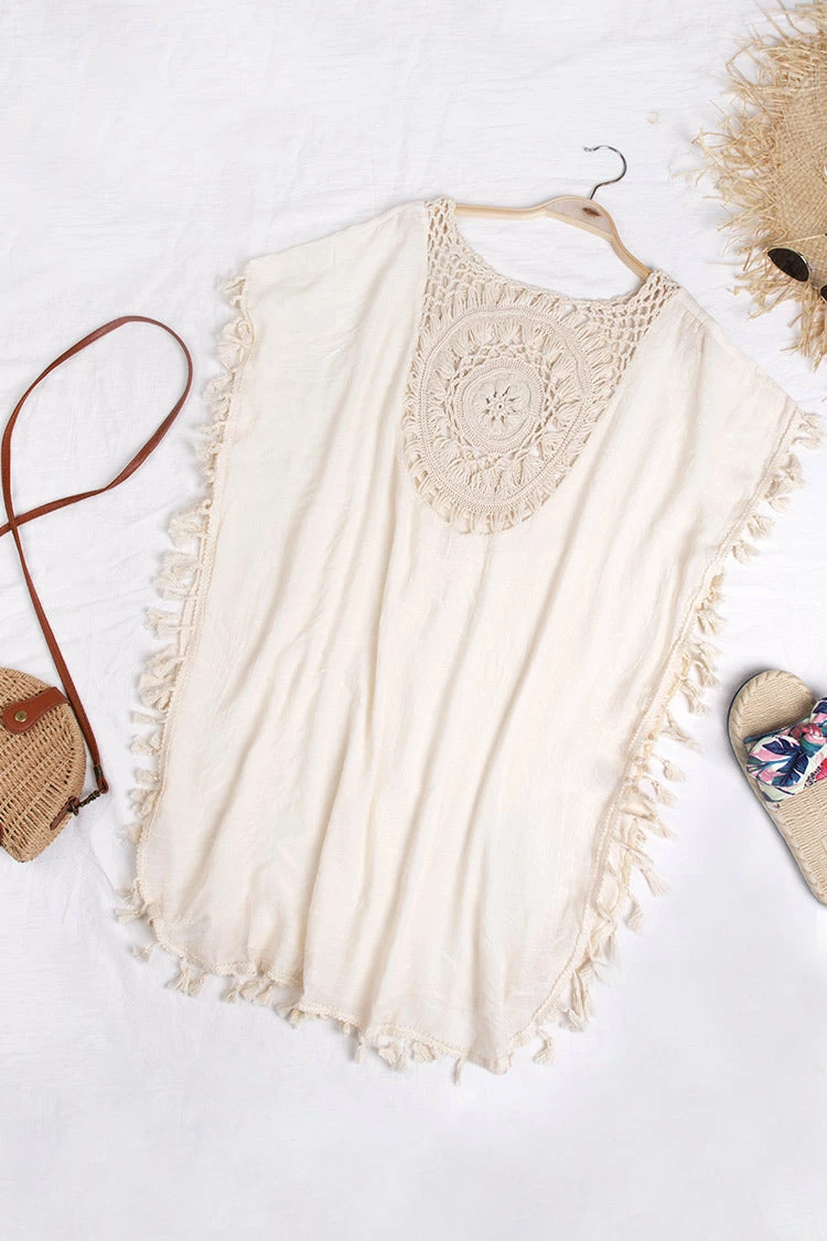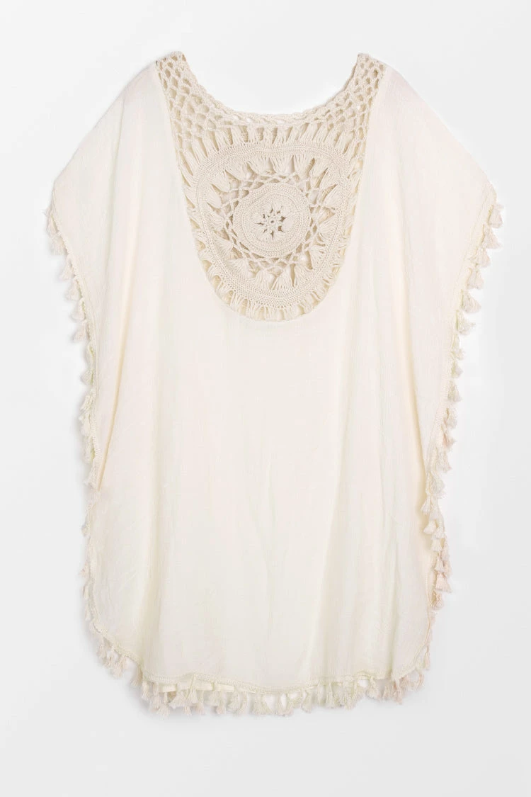 Don’t think twice and give this Dominique Crochet Tassel Trim Cover Up with Geometric Print a try. This unique beach look has just the right amount of boho vibes for your next seaside adventure.