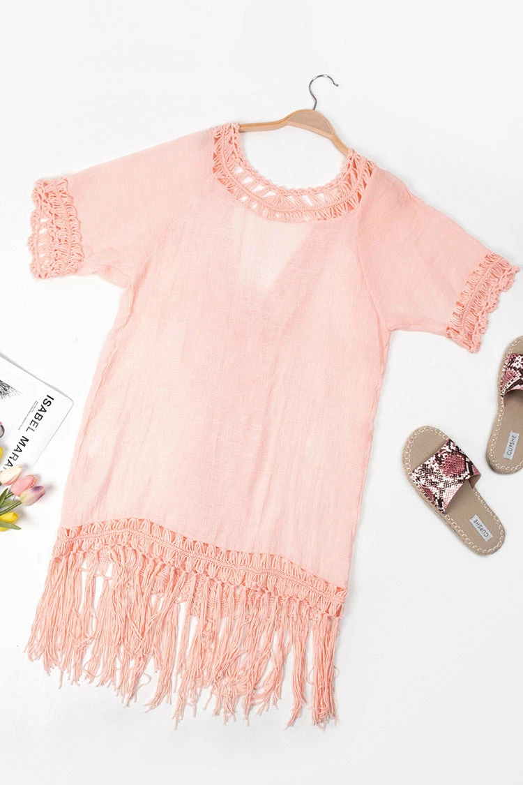 Add a touch of style in our Flamenco Front Open Tassel Crochet Kimono. Features with short sleeves and crochet details. Front open design is easy to wear and there are tassels attached on the bottom of this kimono.