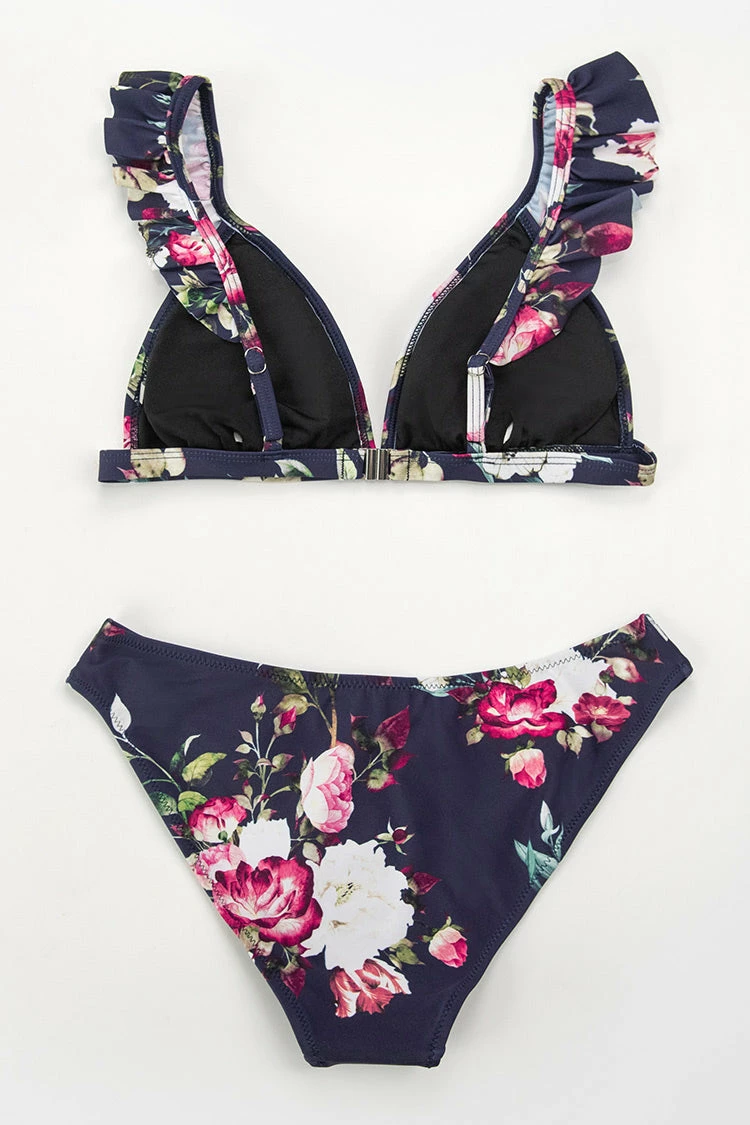 Our Ruffle Floral Bikini set is the perfect combination of beauty and grace. Detailed with ruffle at the straps and along the front. Includes matching bikini bottom.