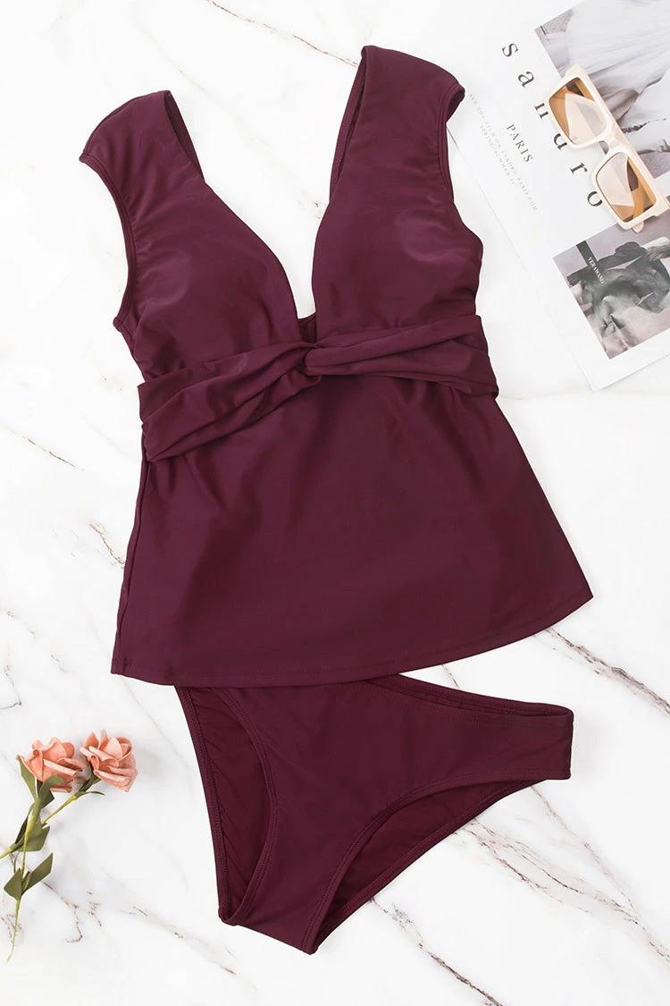 Add a fun twist to your swimwear wardrobe with this tankini & bottom set! It features a sexy plunge neckline with a twist front, cutout detailing and a back hook closure for easy wear. The bottom has a standard rise fit.