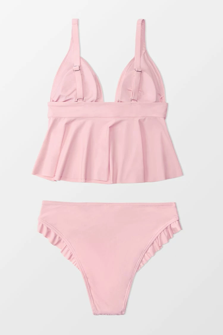 Feel super cute in our Sidney Pink Plunge Ruffle Tankini. Features with tall triangle plunge neckline and ruffle trims on the edge. The bottom has mid waist and mid cut design, marrows attached on edges.