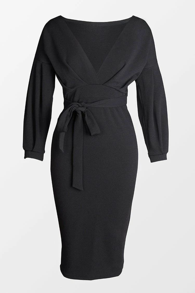 Give your everyday look an edge with this Chyna V-neck 3/4 Sleeve Tie Waist Tea Length Dress. Featuring a tie belt design and a comfy fit. Style with slip-on heels and simple accessories for a look we’re loving.