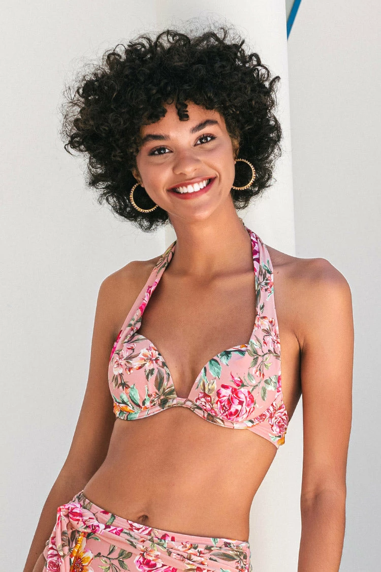 Let the vacay vibes flow in the Rosy Outlook Molded Push Up Halter Bikini Top featuring a halter neckline and back hook. Pair it perfectly with our Rosy Outlook Sash High Waist Bikini Bottom.