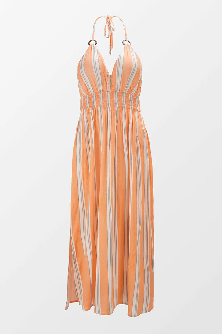 Switch up your look with this Sunny Striped Halter Dress. Featuring a striped pattern with halterneck design and ring detailing. The dress is ultimate blend of beachy and chic.