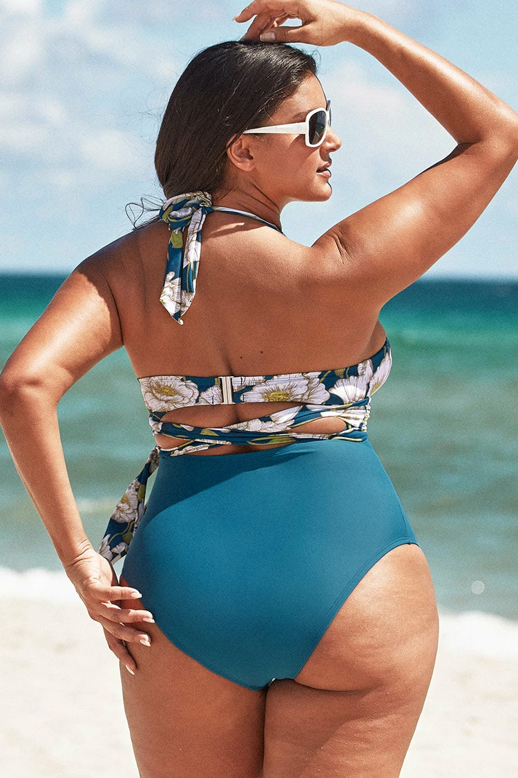 Soak up the sun in our Anna Floral Halter Wrap Plus Size One Piece Swimsuit. Falls from halter to v-neckline, floral pattern on the upper swimsuit. Bold backless design add a touch of sexy.