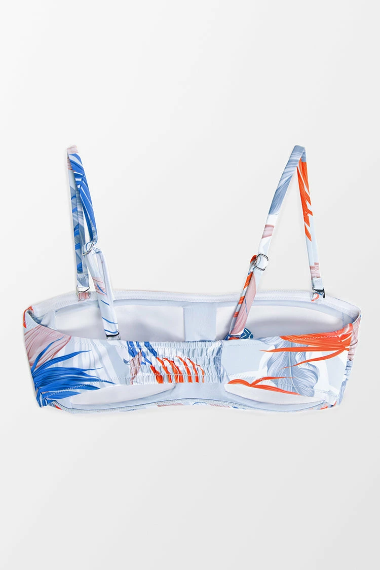 Get yourself ready for the sea in this Carrie Tropical Leafy Bikini Top. The bikini top features tropical leafy print with adjustable thin straps. Wear with our Carrie Blue Mid Waisted Bikini Bottom.