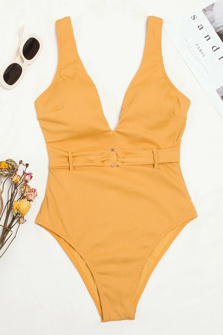 Slay the whole beach in our Lizbeth Rib O-ring Belted One Piece Swimsuit. Features o-ring front, plunging neckline with a belt. Perfect for a day of lounging by the pool or soaking up the sun.