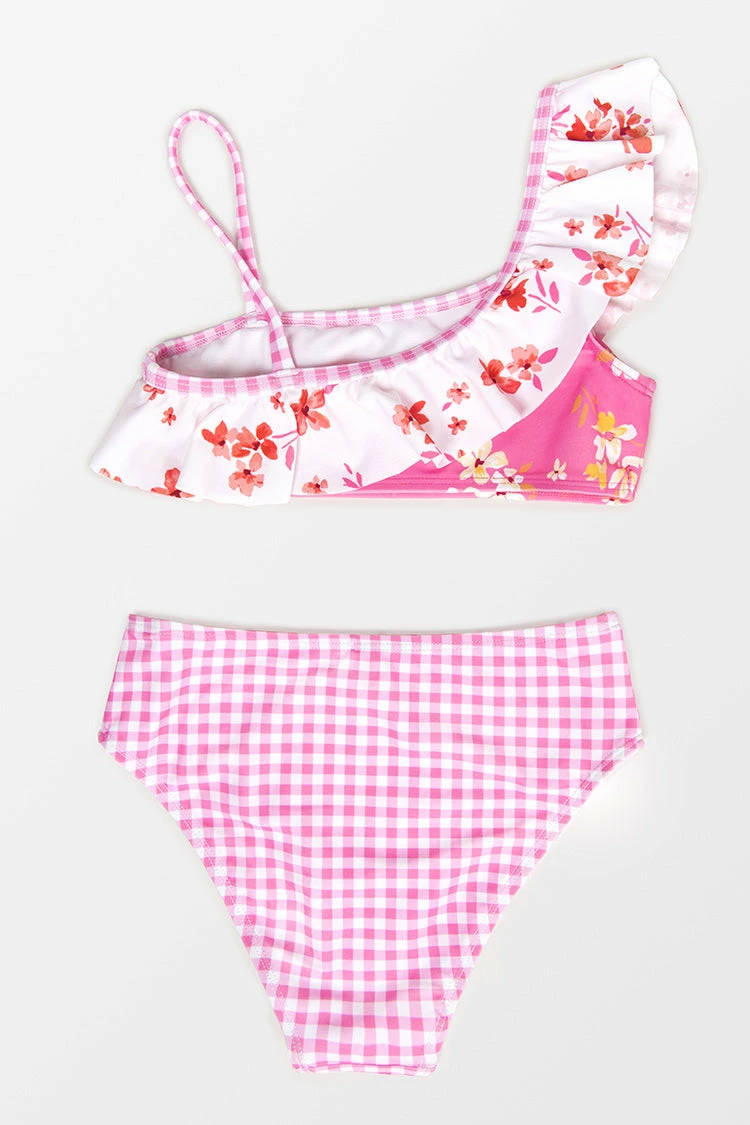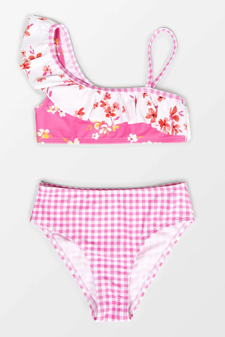 Relax, chill, and feel cute in the Ditsy Mix Ruffle One Shoulder and Hipster Bikini Set. A mix of dainty print patterns makes this bikini set unique and oh-so lovely. The bikini top features an asymmetrical one-shoulder neckline with a ruffled overlay and a thin spaghetti strap. The matching hipster bottom is adorned with a cute plaid print in pink and white colorways.