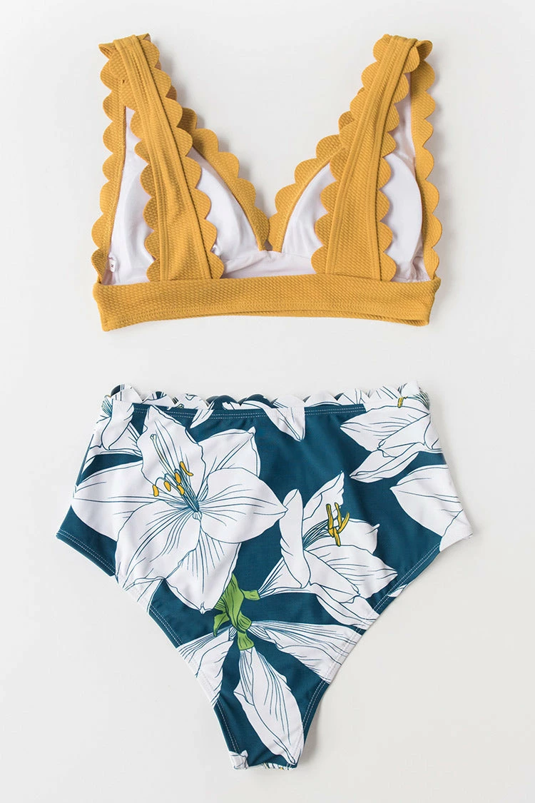 Cute and sweet! Our Yellow and Floral V-Neck Scalloped Bikini set features a scalloped trim bikini. Bikini top is a long line silhouette with wide straps and padded cups. Matching bottom features a cute floral print with a high waisted silhouette.