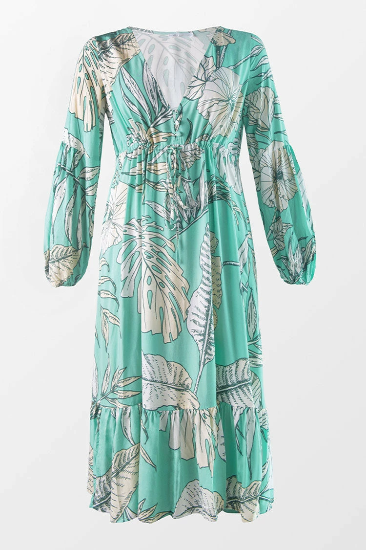 Ariadne Tropical Ruffle Hem Dress is all about relaxing by the beach. The green tropical print all over the body, the ruffle design of this dress, plunge neckline, long sleeve, when the breeze blows, you become a green leaf in summer~