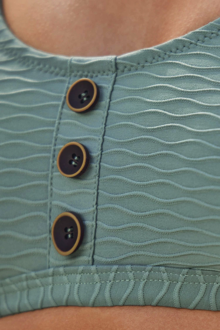 Stay stylish in our Cara Textured Button Front Bikini. Features a sporty textured tank top silhouette with buttons at center front. Matching bottom features a low waisted cheeky fit.