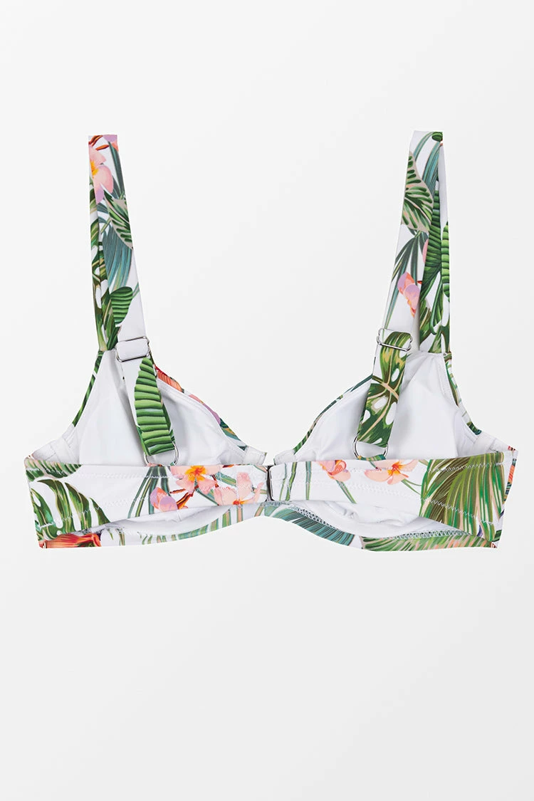 Chase the sun in our Dylan Tropical Underwire Bikini Top. Features tropical and floral print with underwire design. Back hook closure and wide straps for perfect fit.