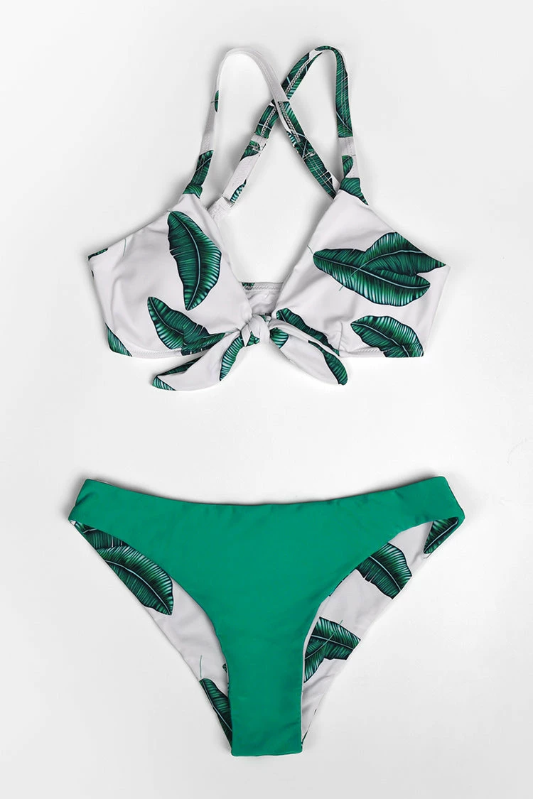Our Leaves Print Bowknot Bikini will never go out of style. The bowknot bikini top features criss cross back straps for added support. Matching bikini bottom features a moderate cheeky coverage.