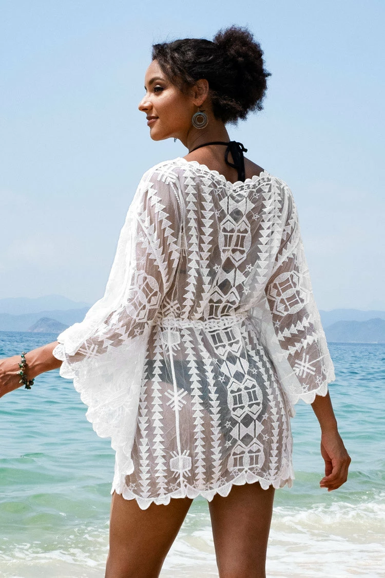Get summer ready with this Melina White Embroidery Mesh Cover Up. Featuring a white embroidery mesh material and drawstring tassel design. Perfect to wear with your favorite bikini or one-piece.