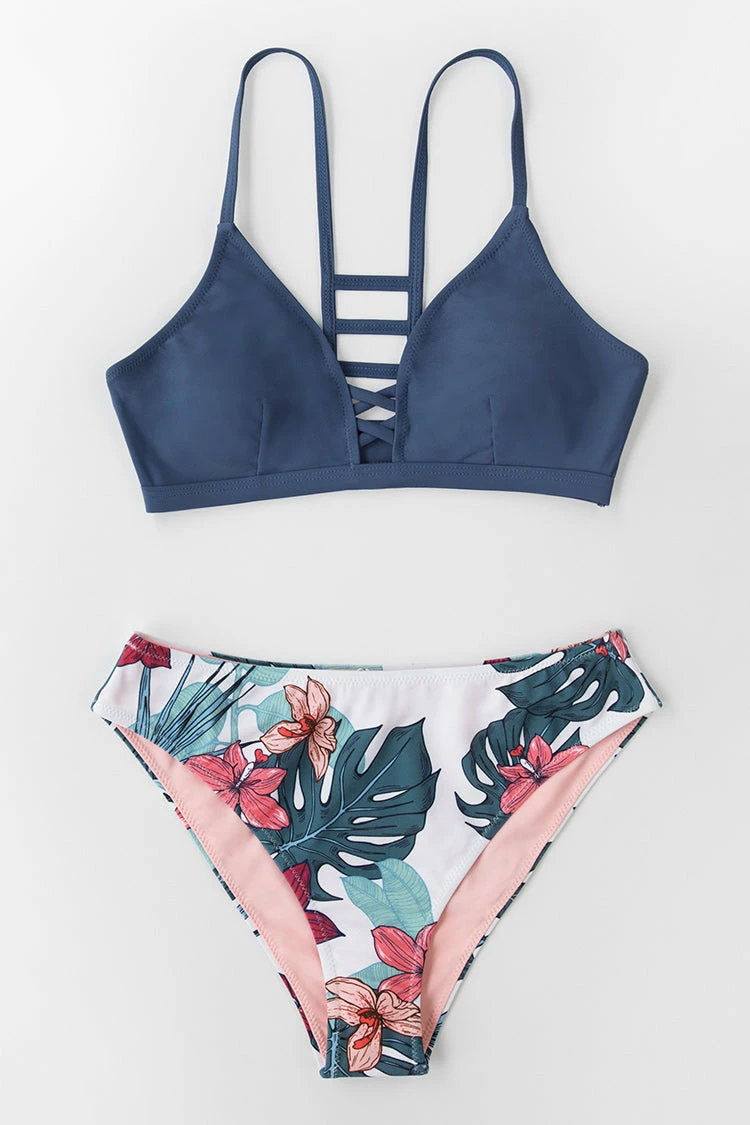 The Navy and Floral Strappy Bikini Set brings a playful style to your swim collection. This bikini set features a strappy criss cross front and a ladder back straps. Bikini bottom has a mid-rise cut and it’s also reversible!