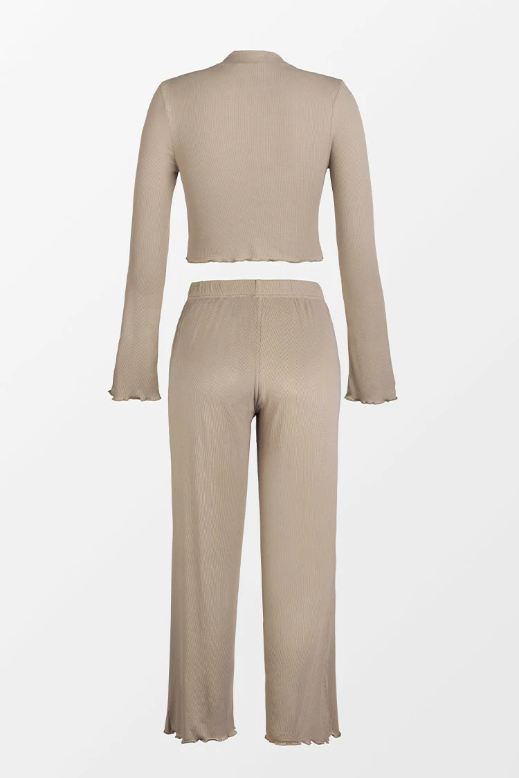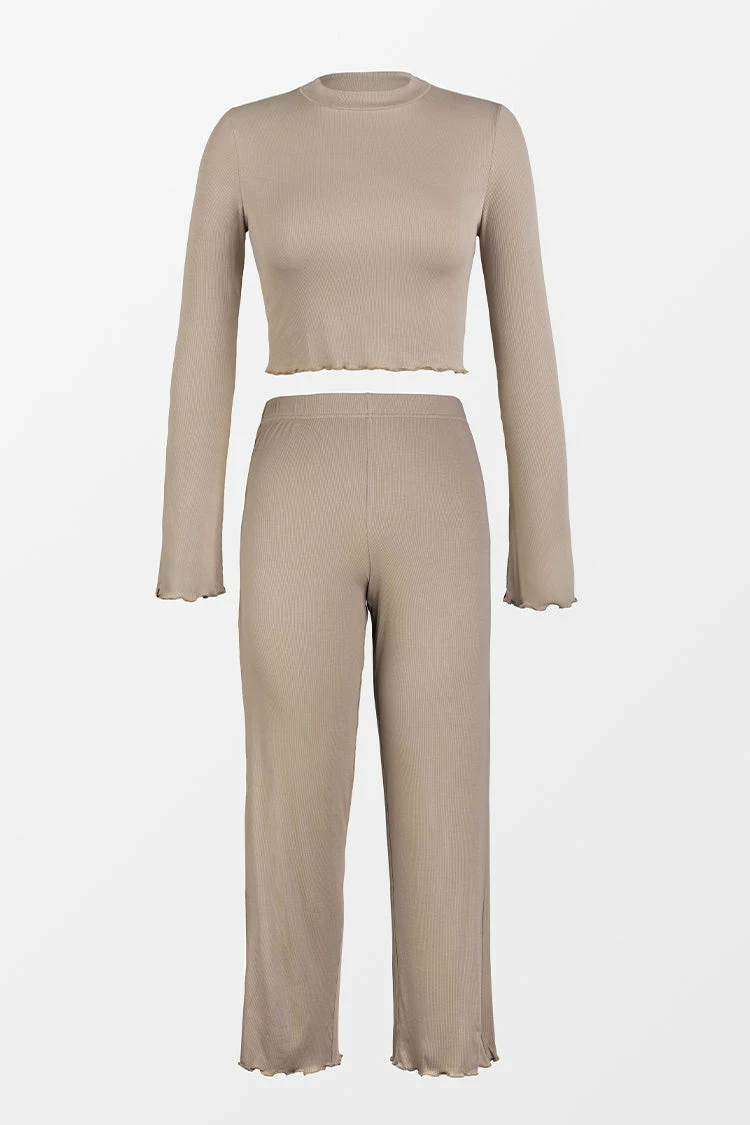 Be comfy in style with this Pompei Crop Top And Pants Set. Featuring a lettuce trim crop top and elasticated waist pants both in a lightweight grey material, we are obsessed. Team this set with slides for the ultimate working from home combo.