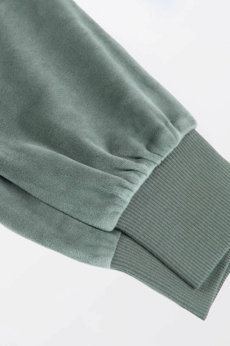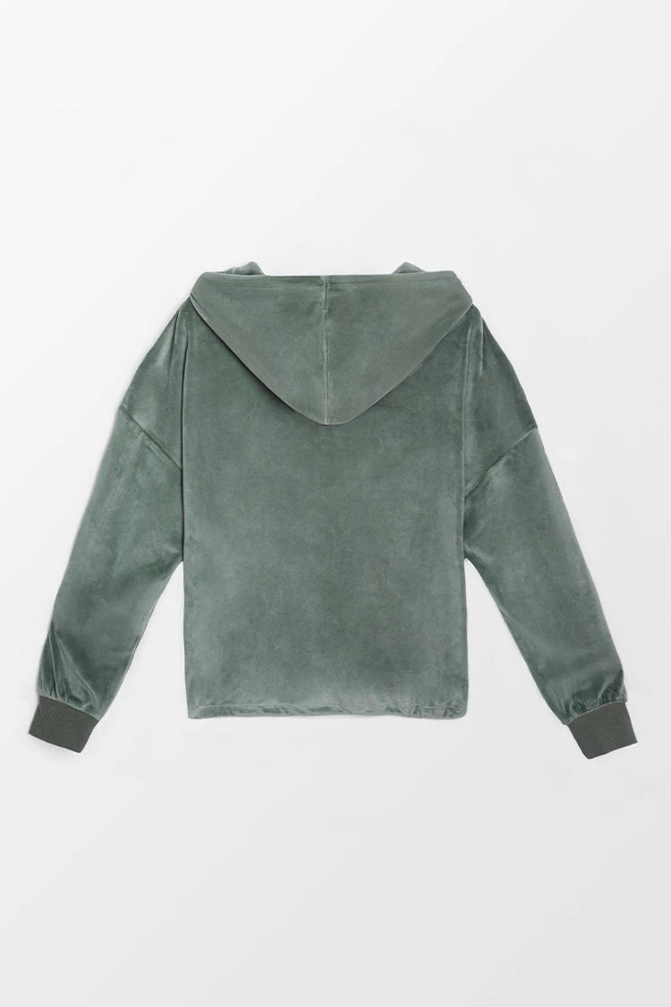 You can lounge in style even at home with the Rosewood Green Long Sleeve Hoodie. Soft knit fabric forms a hooded neckline, and long sleeves with drop shoulders and ribbed knit cuffs. A boxy wide-cut bodice continues to a relaxed silhouette.
