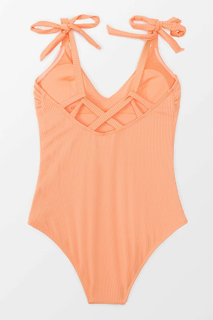 Slay the whole beach in our Claudia Shoulder Tie Criss Cross One Piece Swimsuit. Self shoulder ties falls to a plunge neckline. Crisscross detail on the back.