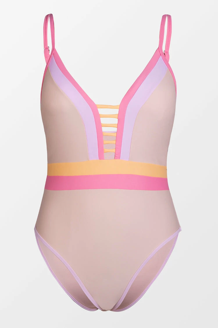 Our Kierra Color Block Strappy One Piece Swimsuit is perfect for the girls who love the beach life! A strappy neckline with contrast detailing give this eye-catching style extra flirty vibes. Adjustable straps and padded cups help provide support and coverage.
