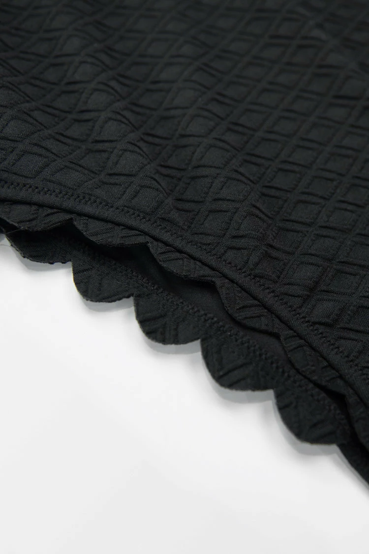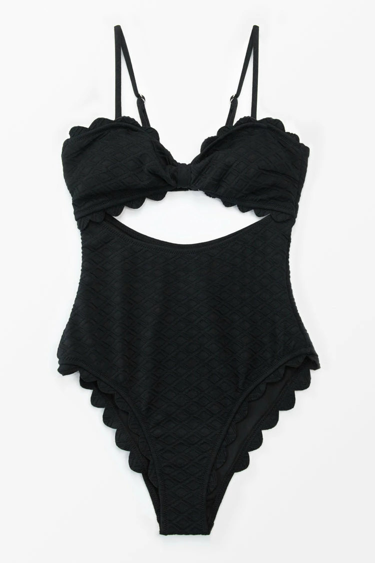 You just can’t go wrong in our Black Knotted Scalloped One Piece Swimsuit. Cut scalloped detailing along the neckline and along the leg opening. The cutout design adds a little flirtiness to this classic swimsuit style.