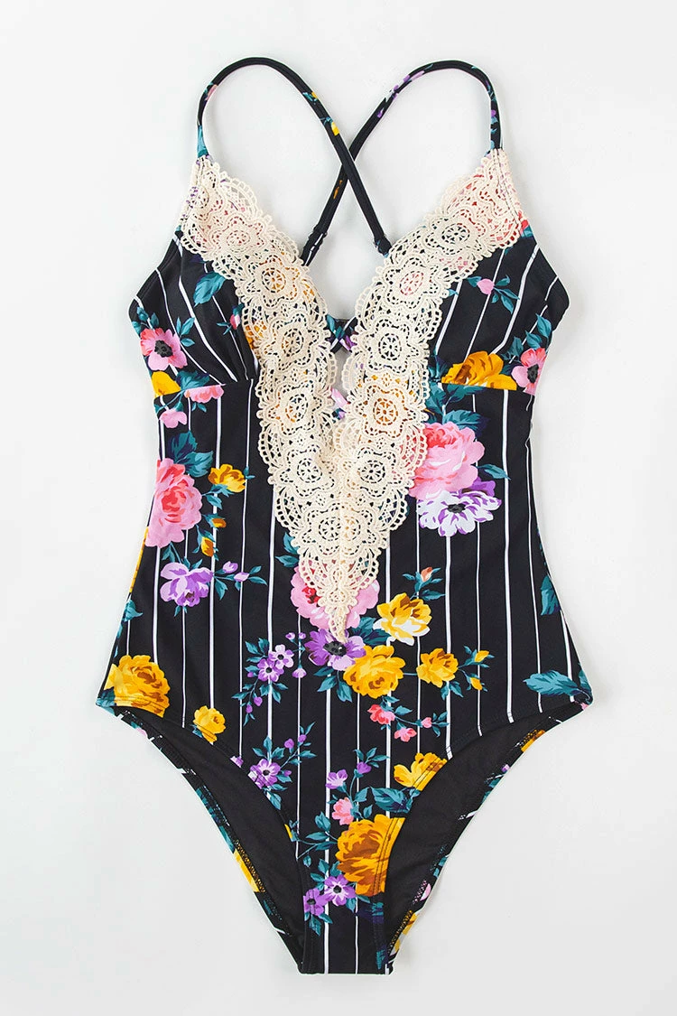 The Francesca Black Floral Plunge Neck Crisscross One Piece Swimsuit brings playful style and functionality to your swim collection. Features a contrast lace plunging neckline with crisscross back straps.