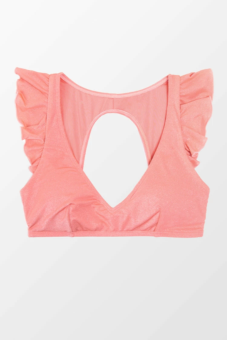 The Noelia Pink V-neck Cut Out Back Tie Bikini Top will be your new fave! Features a v-neckline and ruffles on the shoulder with a big cut out and back tie which adds touch of fun! Pair it with our matching bottoms.
