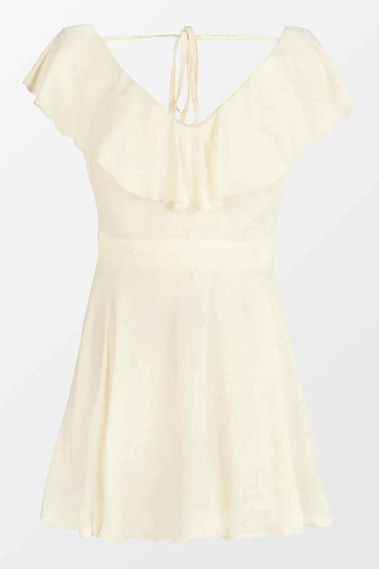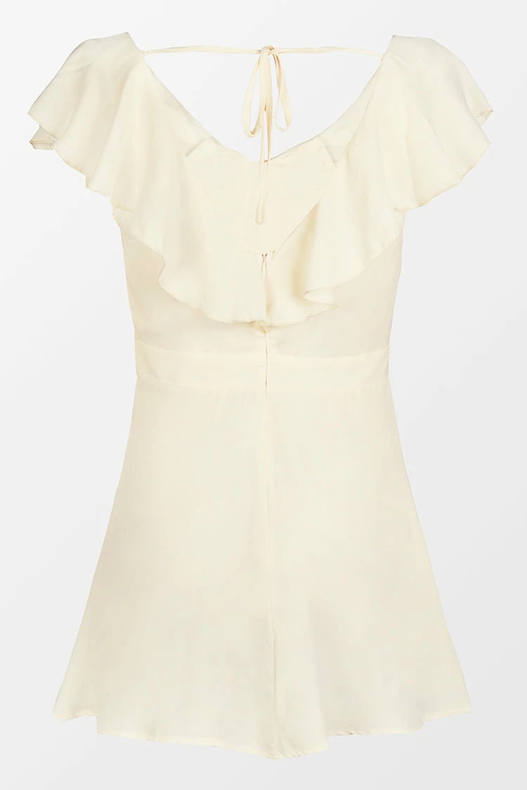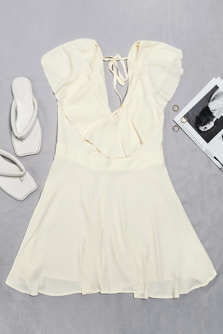 Raelynn V-neck Ruffle Mini Dress is a major stunner. Features with v-neckline decorated with ruffles on the edge. Back zipper for easy wear. Pair it with wide brimmed straw hats.