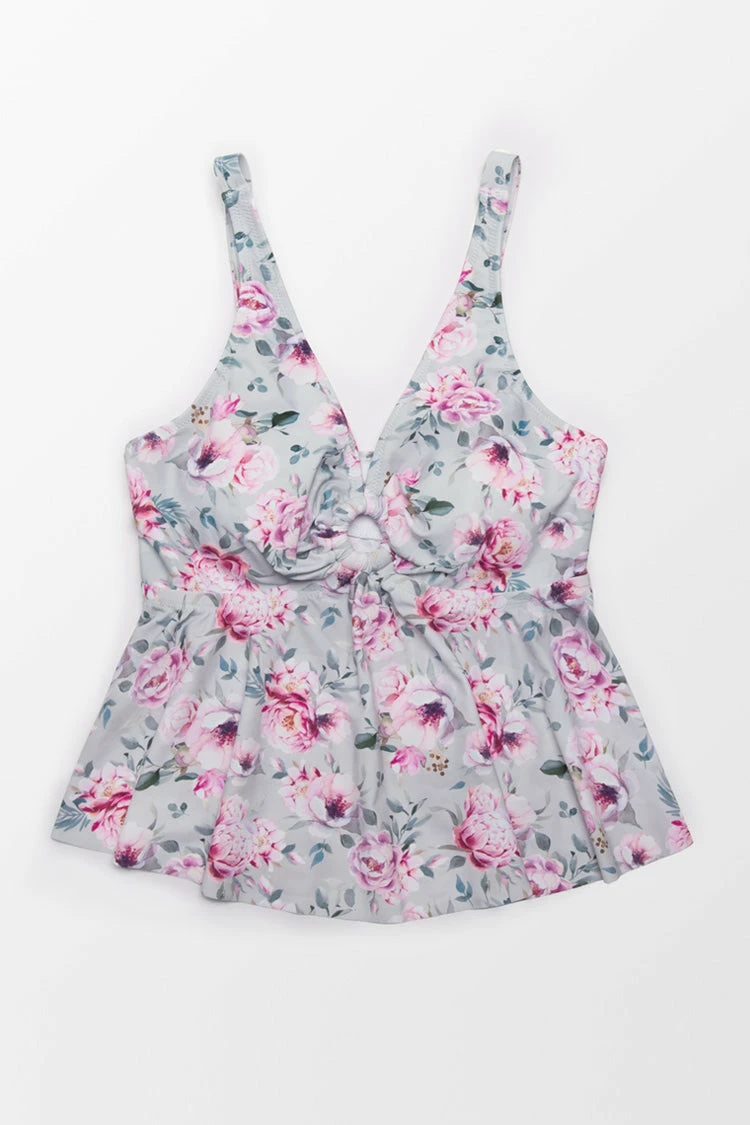 Our Floral Plus Size Ruffle Bikini Top is the perfect beach look whether you’re sunbathing or just cooling off in the waters! Features an o-ring detailing with padded cups for light support.