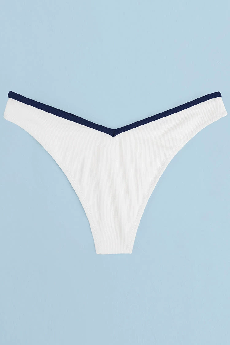 Show off your curves in Lyanna White Rib Contrast Trim Bikini Bottom. Flattering leg cut to highlight your legs. Wear with Lyanna White Rib Underwire Bikini Top to complete this look!