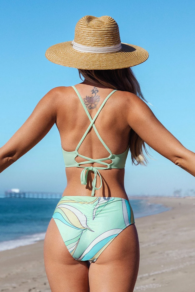 The Retro Dreaming Faux Wrap Bralette and Back Shirred Hipster Bikini Set is the perfect option for babes who adore chic retro styles. The bralette bikini top offers natural comfort and features a faux wrap front with adjustable cross back straps. The hipster bikini bottom has an all-over abstract print and a back shirring detail for added definition.