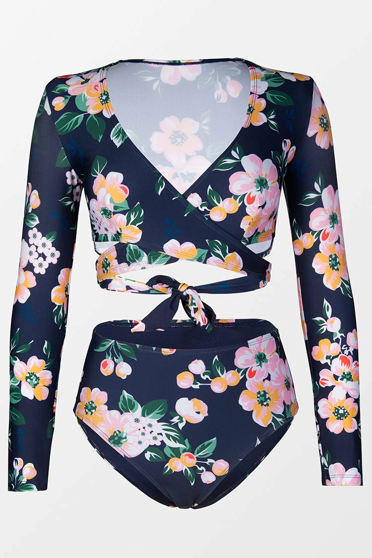 Swim like a fish in our Sariah Floral Wrap Long Sleeve Bikini. Long sleeves and features with wrap design and self back tie. The bottom shares the same pattern with the top for better match.