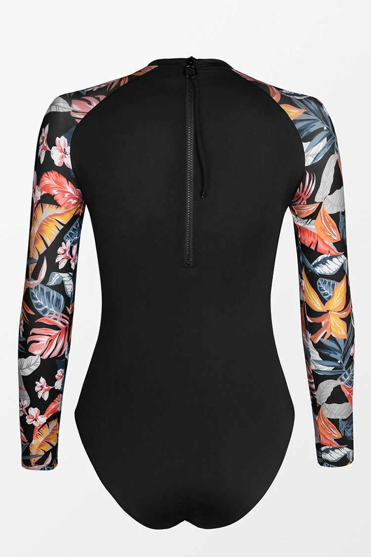 Give your look a chic update with Sariyah Tropical Zipper Long Sleeve One Piece Swimsuit. Features raglan long sleeves, back zip, all black bodice and tropical print on the sleeves add more fun.