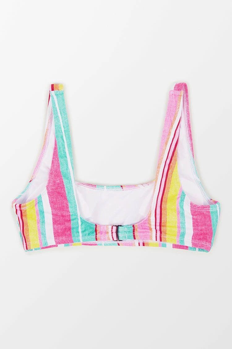 The Soleil Stripe Bralette Bikini Top has a stunning stripe pattern that incorporates vivid colors and adds dynamic style to your swim look. The bralette tank top design offers good coverage and is perfect for all your waterside adventures. The back hook closure provides a secure fit.