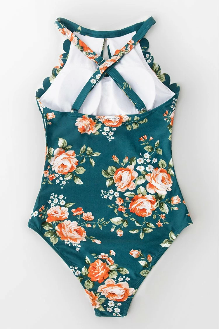 Teal Floral Scalloped One-piece Swimsuit is a sophisticated option for your vacation. Features a keyhole cutout on the front and detailed with scalloped trim.