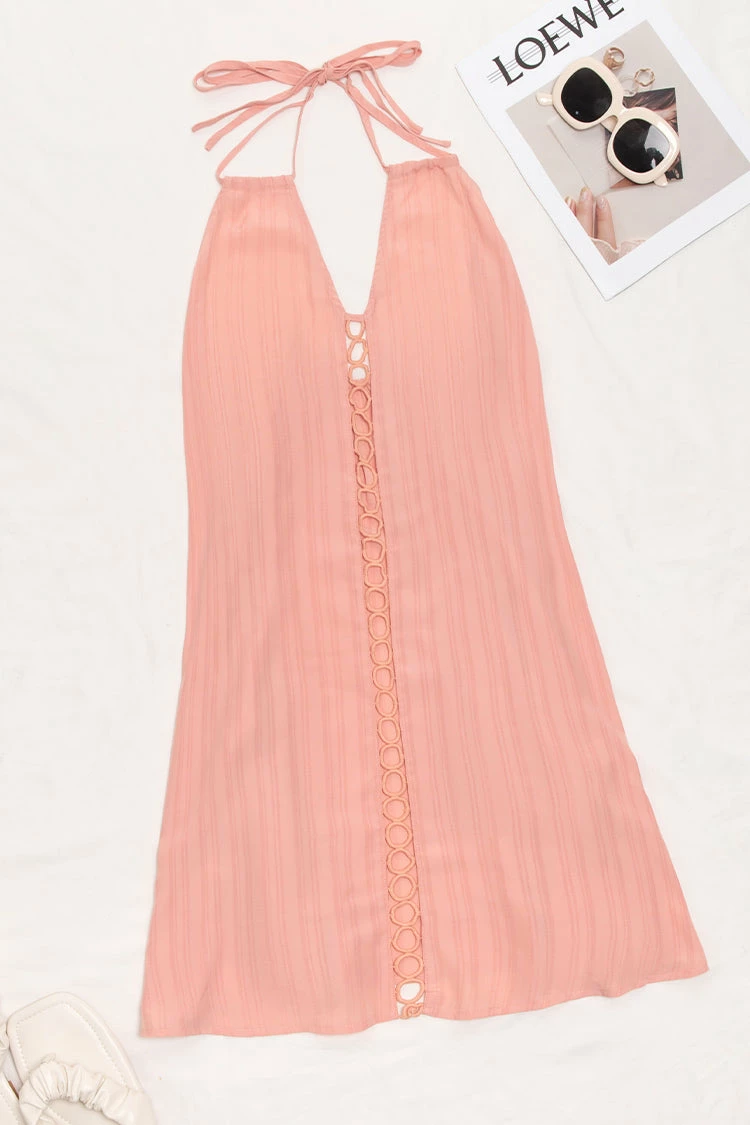 Give your vacay collection a bright update with Yasmine Halter V-neck Backles Slip Dress. Features with v-neckline and halter tie. Bold backless detail with comfortable loose waist.