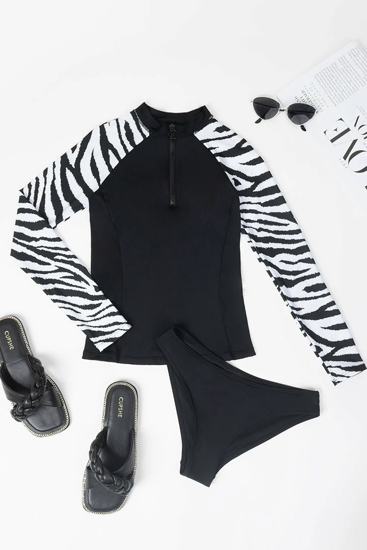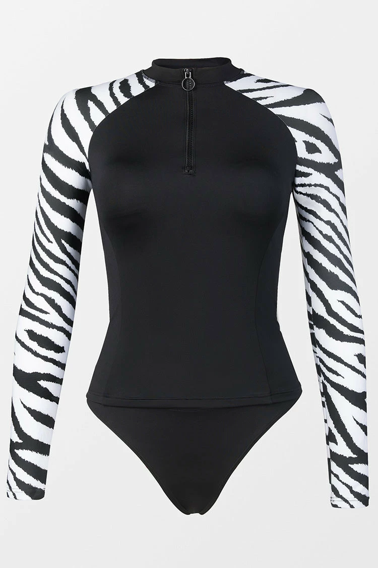 Catch everyone’s eye in this Zahra Zebra Print High Neck Long Sleeve Tankini. Gorgeous zebra print on the sleeves with an all-black bodice and a zip front creates a sporty and modern feel.