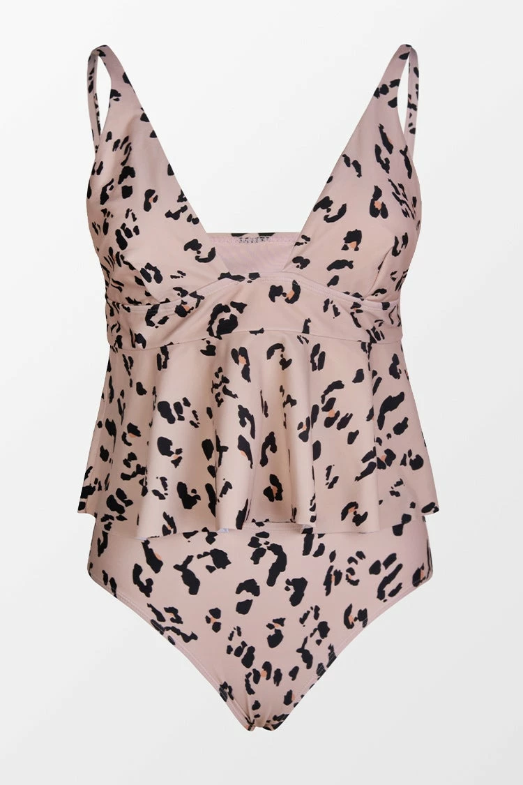 Feel cute and comfy in our Audrey Leopard?Ruffle Hem Ruched Back Tankini. Bikini top features wide straps and ruffle hem. Bikini bottom features mid waisted fit and ruched back for extra coverage.